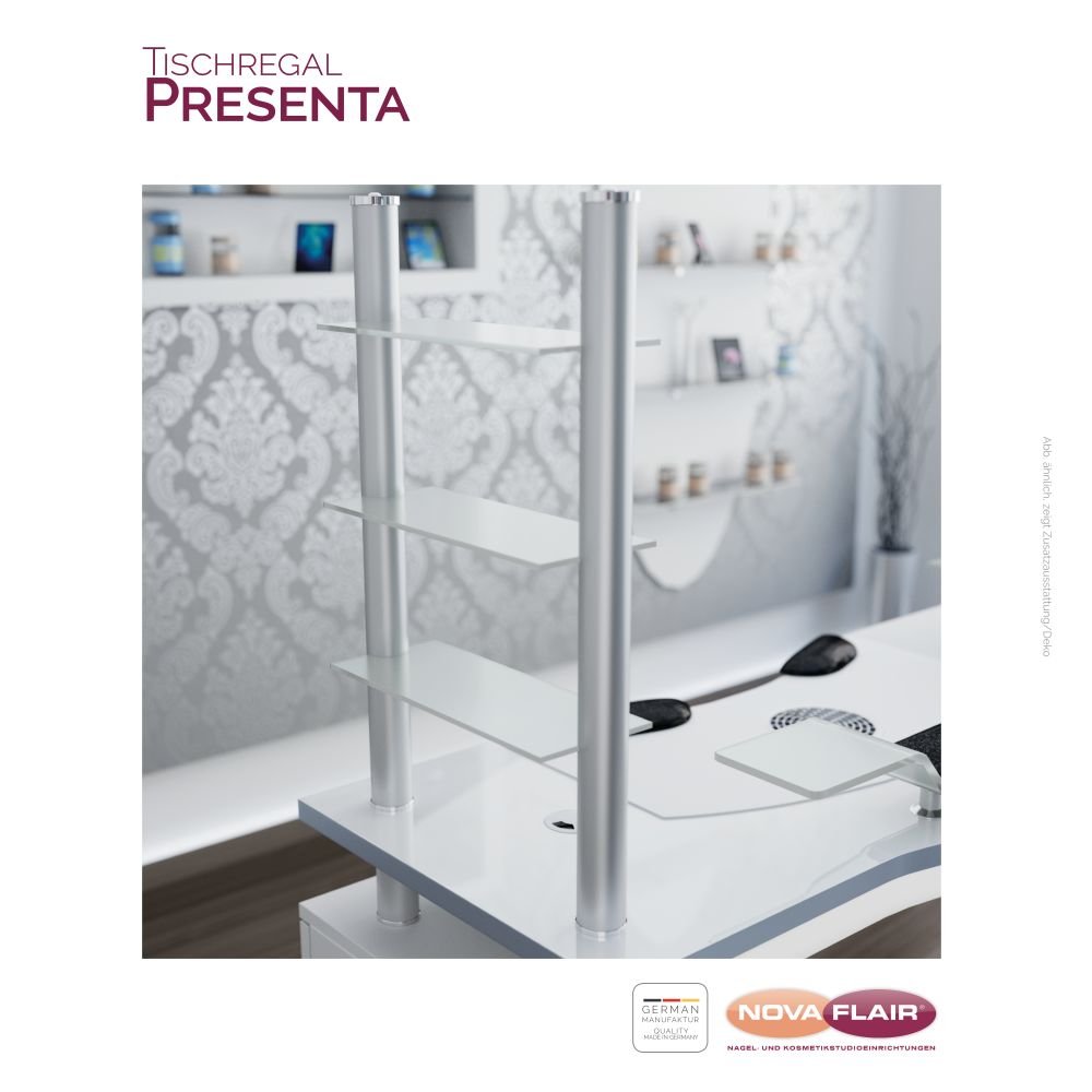 Mensola in alluminio con 3 ripiani in vetro satinato per il montaggio a fianco del tavolo. Molto adatto per la presentazione dei prodotti in vendita direttamente al cliente.