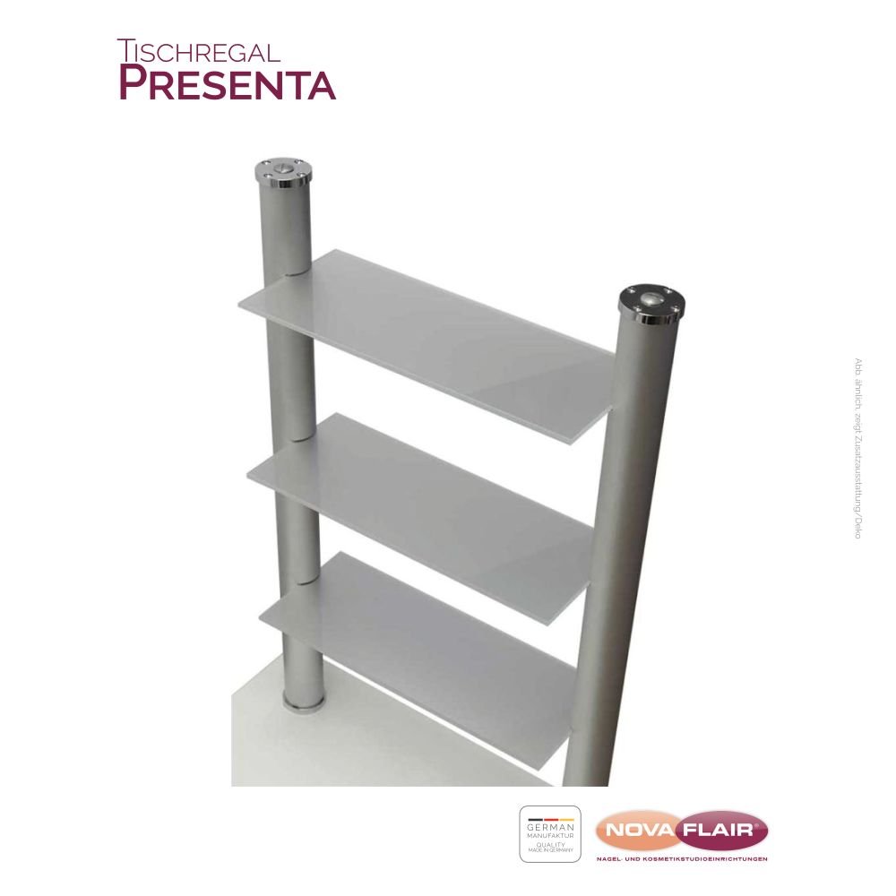 Mensola in alluminio con 3 ripiani in vetro satinato per il montaggio a fianco del tavolo. Molto adatto per la presentazione dei prodotti in vendita direttamente al cliente.